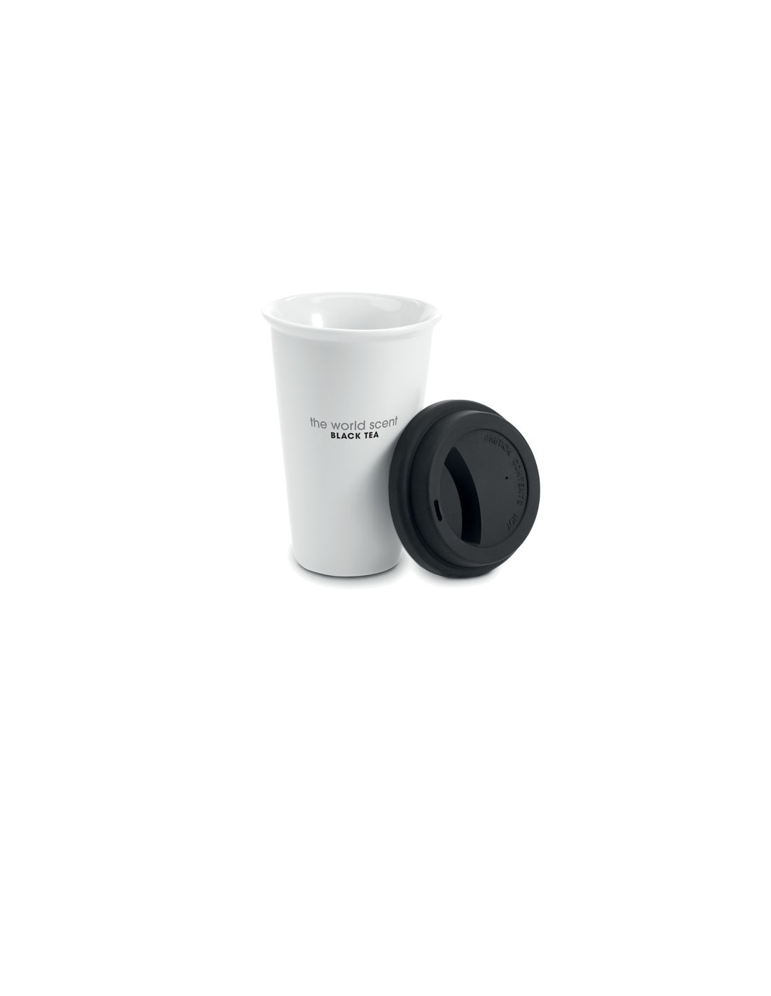 Bicchiere in ceramica con doppia parete e tappo in silicone. Ideale per bevande calde. 275ml.