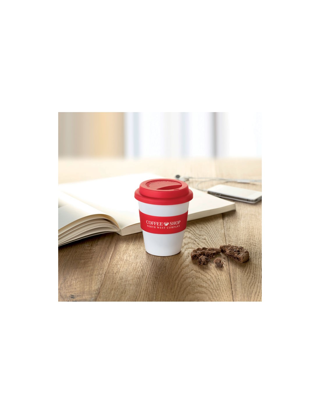 Bicchiere da bibita in PP bianco lucido a strato singolo, con coperchio e anello intermedio in silicone. Capacití 350ml. Disponendo di un solo strato potrebbe scaldarsi anche esternamente.