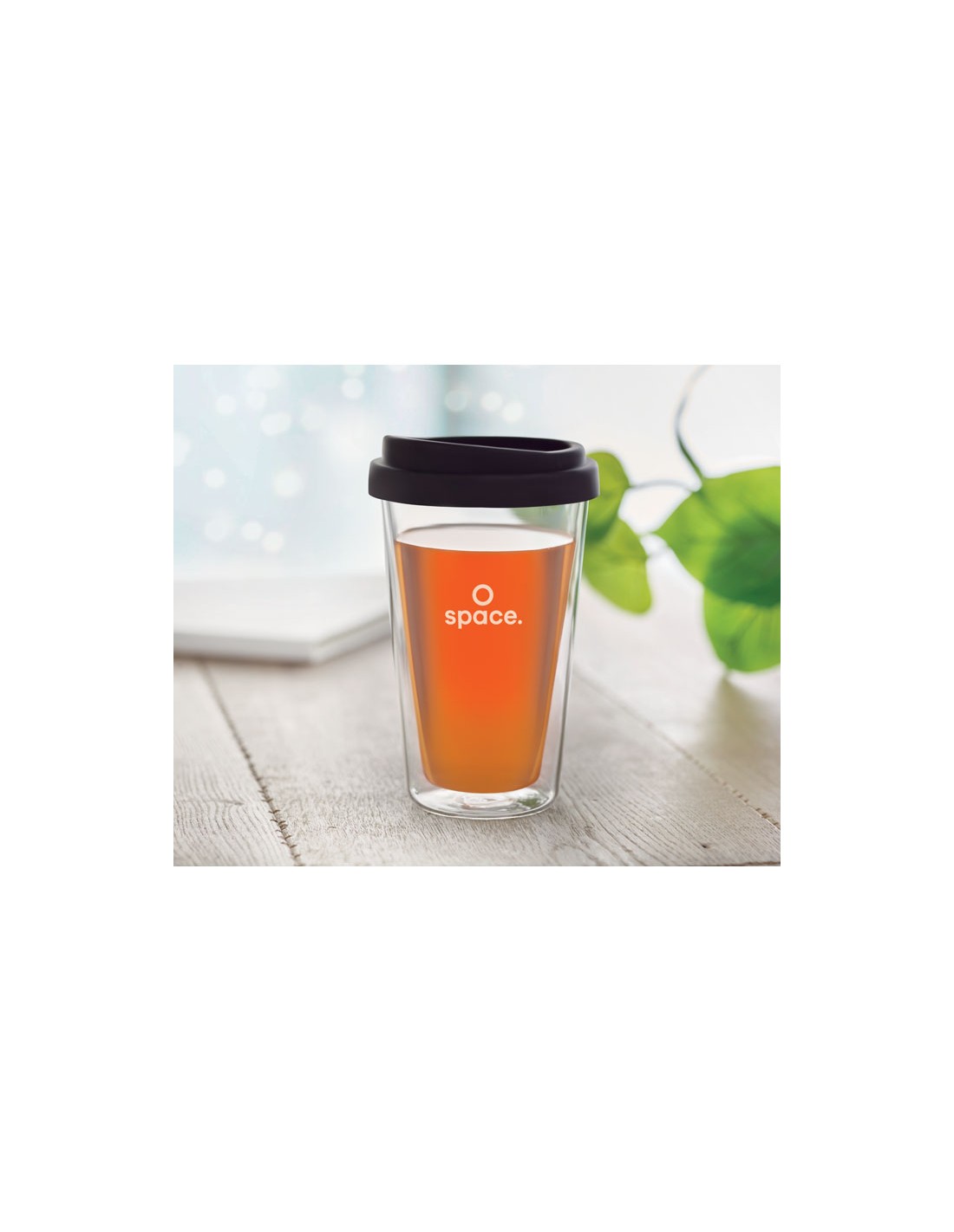 Bicchiere in vetro doppio strato borosilicato, con coperchio in silicone. Capacití 350ml.