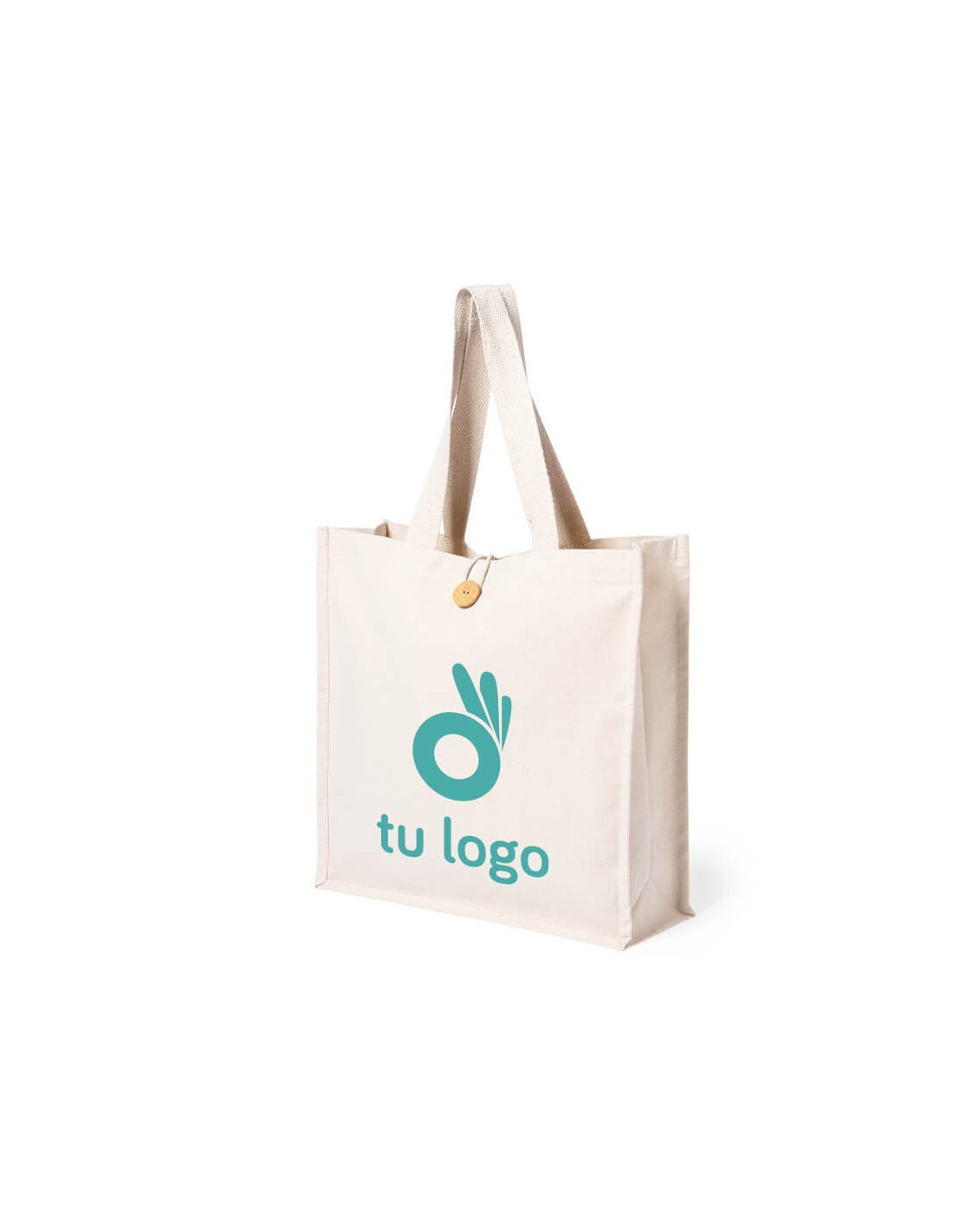 Bolsa fabricada en algodón 100%, de acabado natural y en gramaje extra de 310g/m2. Con original cierre de botón, acabado cosido y con fuelle. Asas medianas extra anchas y reforzadas (60 x 3,5 cm). Resistencia hasta 10 kg de peso.