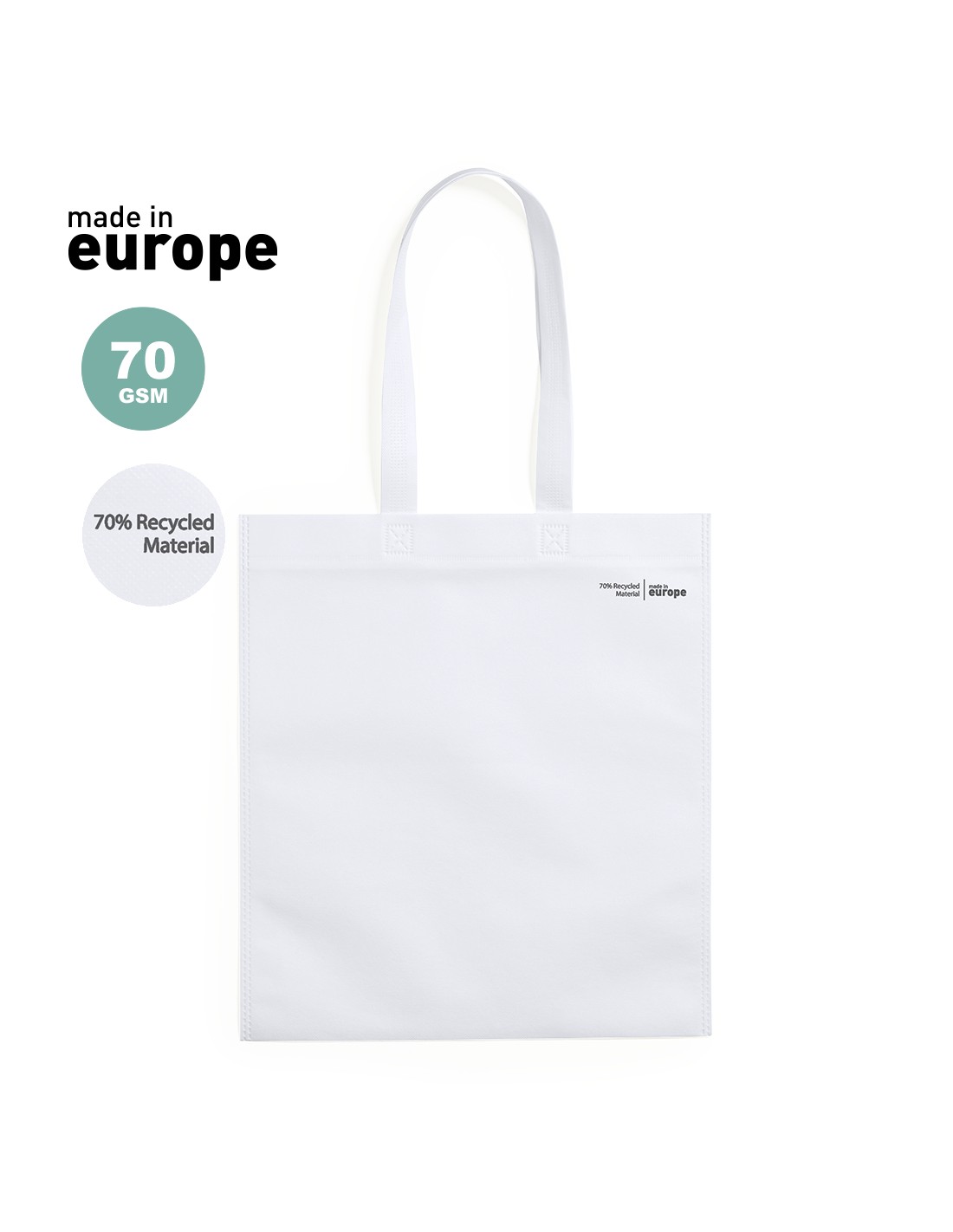 Bolsa de línea nature, fabricada en non-woven reciclado de 70g/m2. De fabricación europea, con acabado termosellado, asas largas y distintivo eco/made in sobre la bolsa.