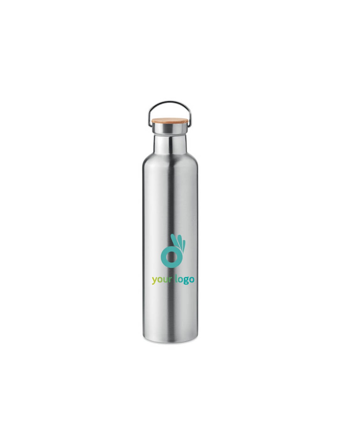 Thermos doppio strato isolante in acciaio inox con tappo in bamboo e manico per il trasporto. Capacití : 1L