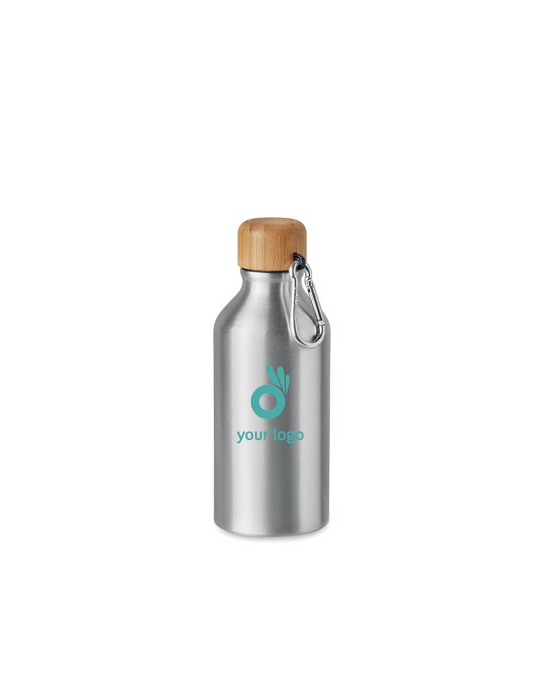 Bottiglia in alluminio singolo strato con coperchio di bamboo e moschettone. Capacití : 400 ml. Il moschettone non í¨ per uso professionale.