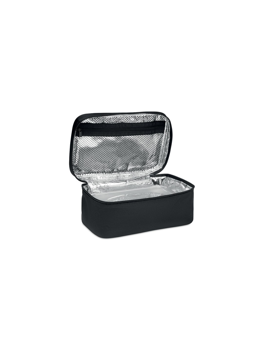 Borsa termica termica in 600D RPET. Include un portapranzo riutilizzabile in PP con capacití di 1900 ml. Fodera in foglio di alluminio da 2 mm.