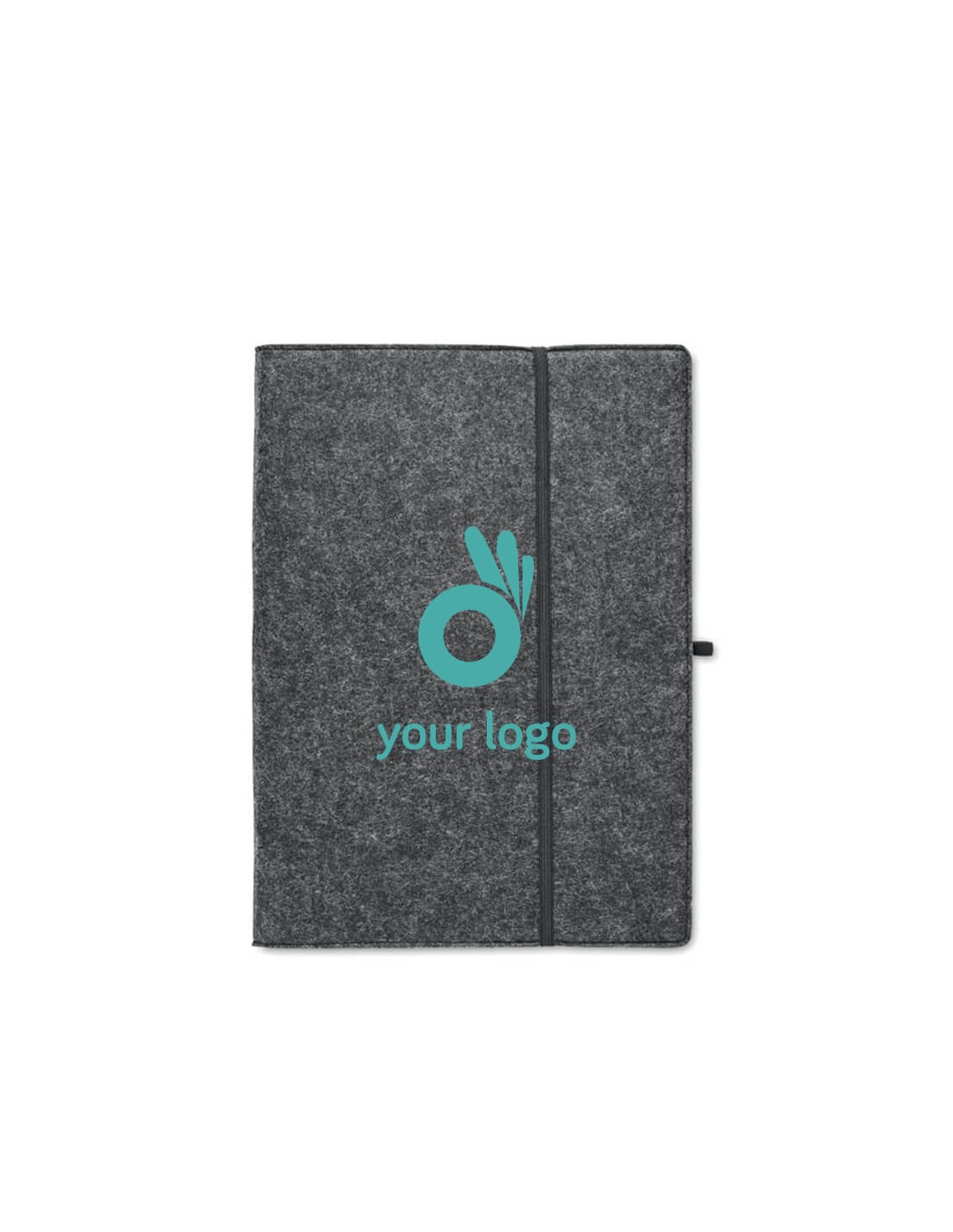 Porta documentos A4 en fieltro RPET. Bloc de notas de 100 hojas rayadas con porta bolÃgrafos elástico.