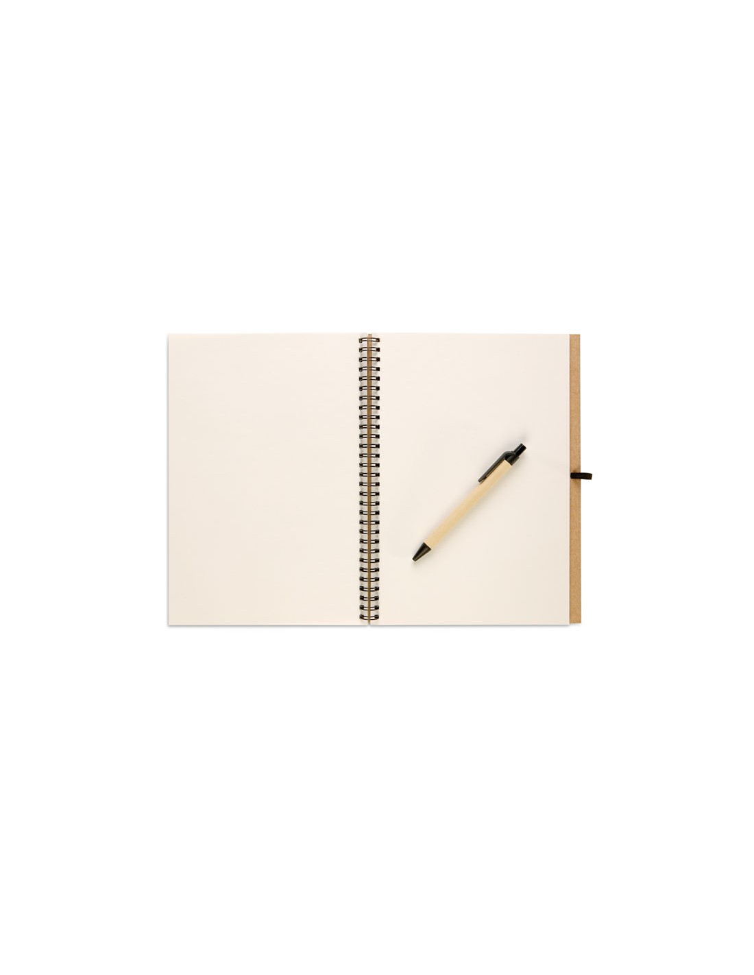 Libreta con cubierta negra o marrón natural con 70 páginas de papel reciclado y un bolígrafo reciclado biodegradable de tinta azul.