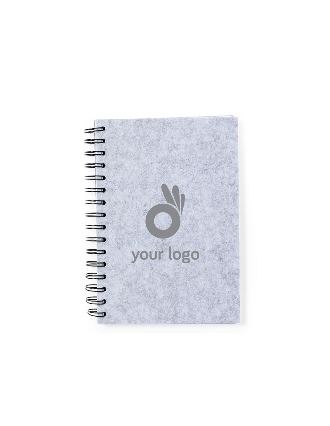 Libreta de anillas con tapas en suave fieltro RPET reciclado. Interior con 100 hojas blancas con disposición a una raya. Incluye distintivo RPET. Presentado en bolsa individual reciclada.El fieltro RPET reciclado es fruto de la combinación del proceso de reciclaje de materiales plásticos junto a la técnica milenaria de fabricación del fieltro, dando como resultado un material de eco-tendencia que, además de ser de origen reciclado, también se convierte en reciclable. 100 Hojas