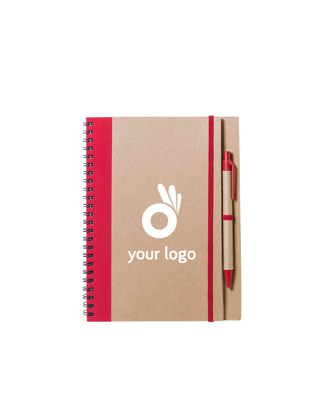 Cuadernos publicitarios de tacto suave hechos en resistente cartón reciclado y de tamaño A5. Estos cuadernos disponen de una cinta elástica de sujeción que permite cerrar la libreta y hacer de marca páginas. Incluyen un bolígrafo a juego reciclado. Disponen de 60 hojas lisas y un soporte para guardar el bolígrafo. Se pueden personalizar en la portada con cualquier logotipo o imagen corporativa. Disponibles en 7 colores diferentes. Material: Cartón Reciclado Medidas: 16.5 x 21 x 1 cm Peso: 180 g Papel: liso
