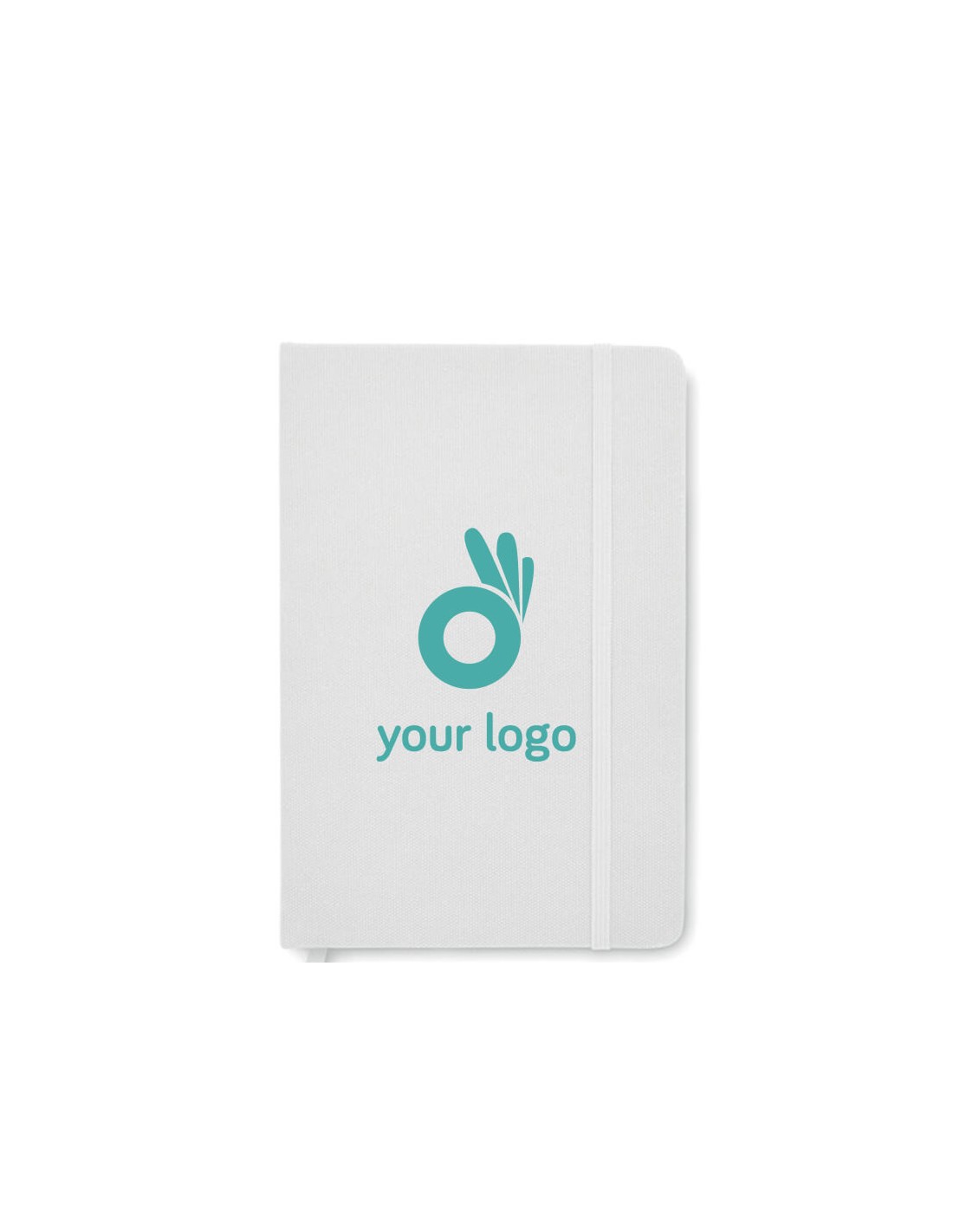 Libreta A5 con tapa dura de 600D RPET y 80 hojas rayadas de papel reciclado con banda elástica y marca páginas.