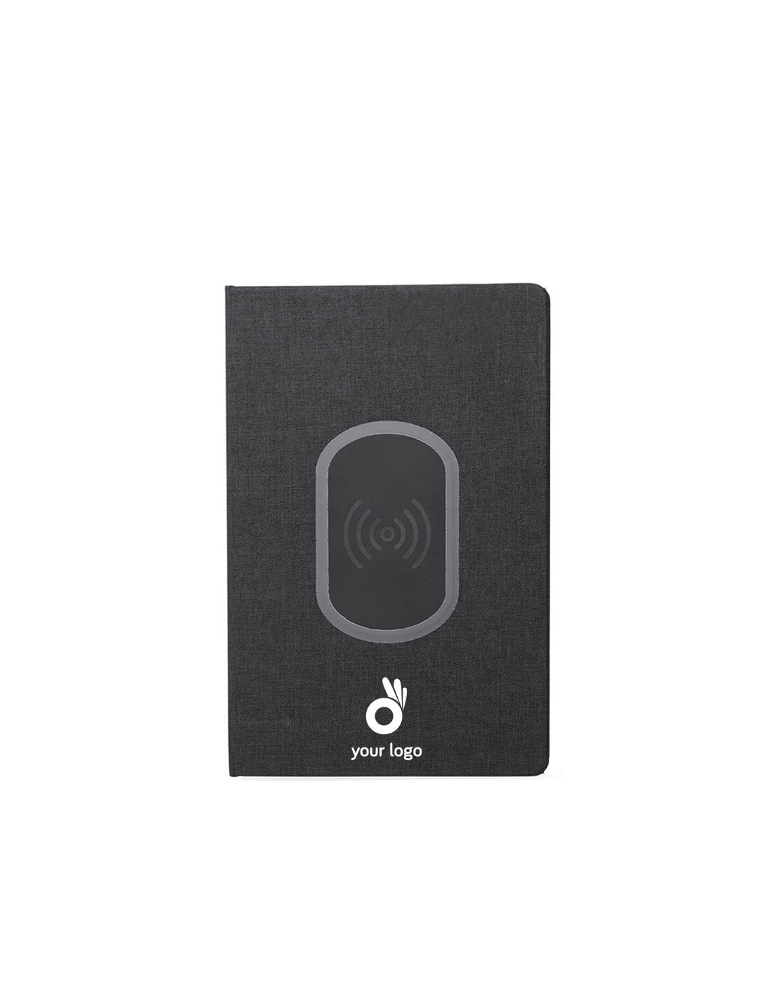 Libretas serigrafiadas para hacer publicidad de una forma totalmente diferente a lo habitual. Su portada rígida, hecha en poliéster 300D, incorpora una base de carga inalámbrica compatible con todos los dispositivos que incluyen esta tecnología. Se trata claramente de un artículo 2 en 1 que no tiene fecha de caducidad, ya que cuando se terminan las páginas, se puede seguir usando el cargador inalámbrico tanto tiempo como uno quiera. Cuentan con 80 hojas de papel rayado. Añadir tu logo en su portada hará que proyectes una imagen de empresa moderna y destacada. Incluyen cable de carga. Disponibles en color negro. Material: Poliéster 300D Medidas: 14.5 x 21.5 x 1.8 cm Peso: 300 g Papel: rayado