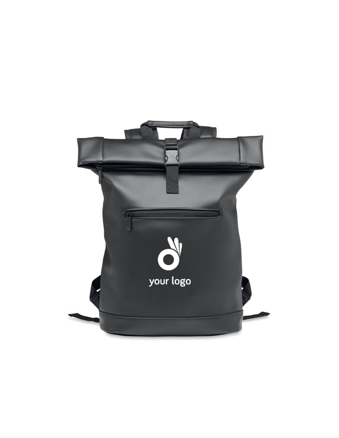 Mochila roll top para portátil de 15'''' en suave PU con respaldo acolchado y base reforzada. Gran bolsillo frontal con cremallera. El forro es de RPET 210D.