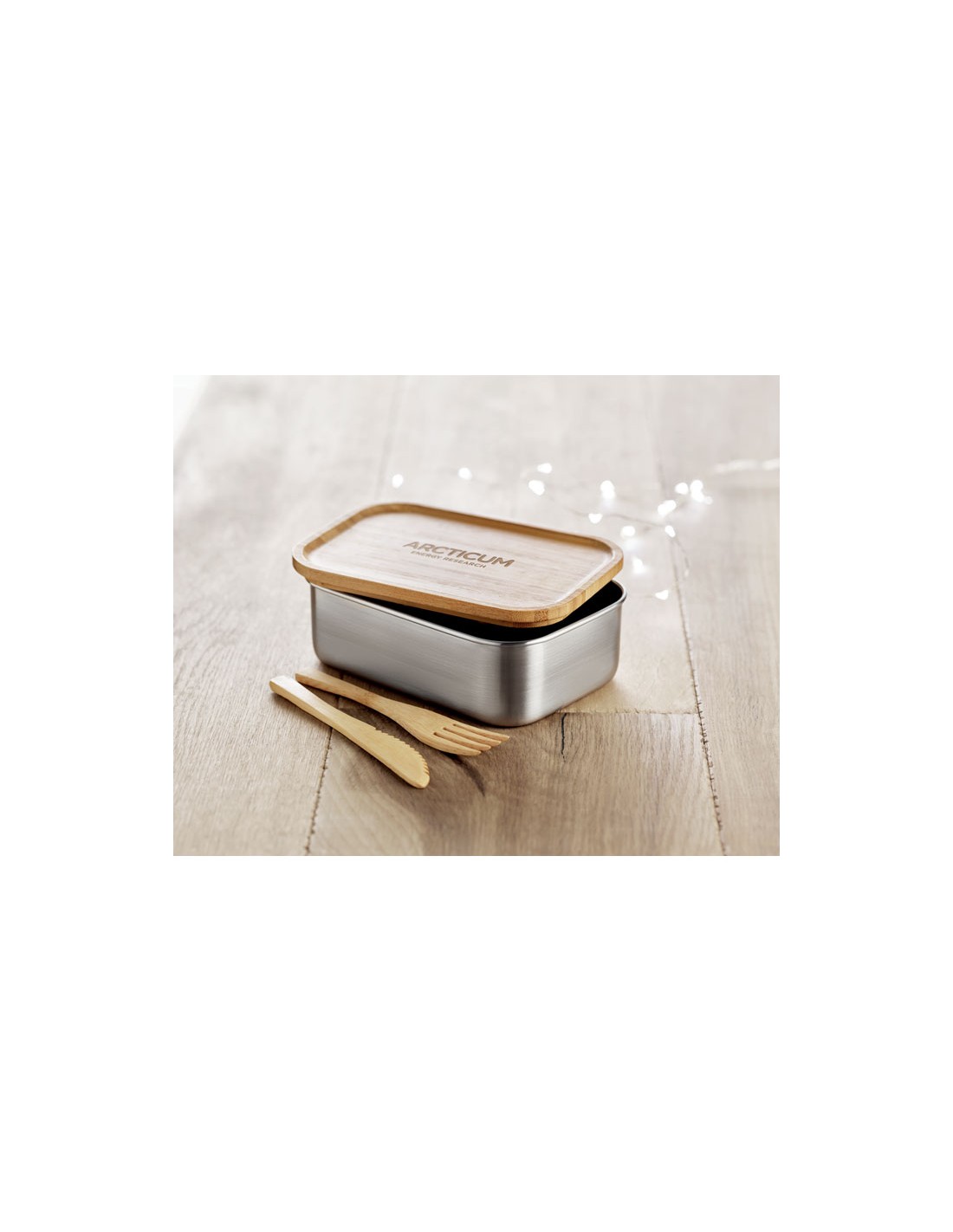 Portapranzo in acciaio inossidabile con coperchio in bamboo e 2 posate con fascia in poliestere removibile. Capacití 600 ml. Il bamboo í¨ un prodotto naturale, potrebbero esserci lievi variazioni di colore e dimensioni da un articolo all'altro, che possono influire sul risultato finale della personalizzazione.