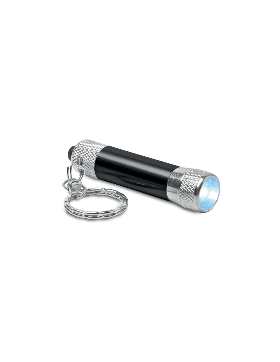 Mini torcia in alluminio 1 led, con portachiavi. 4 batterie LR44 incluse.