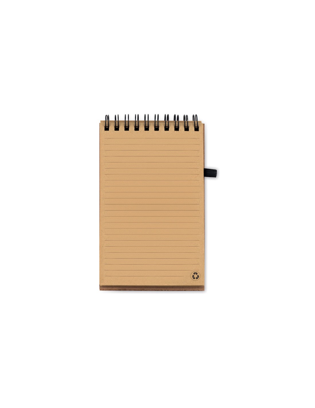 Blocco note A6 con copertina in sughero. Doppia spirale. 70 fogli di carta riciclata a righe. Penna a sfera a pulsante abbinata con fusto in cartone riciclato e dettagli in PLA di mais. Inchiostro nero. Cinturino elastico di chiusura e portapenne. Il sughero í¨ un materiale naturale al 100%. A causa della sua natura strutturale e della porosití della superficie, il risultato di stampa finale per articolo potrebbe presentare deviazioni.