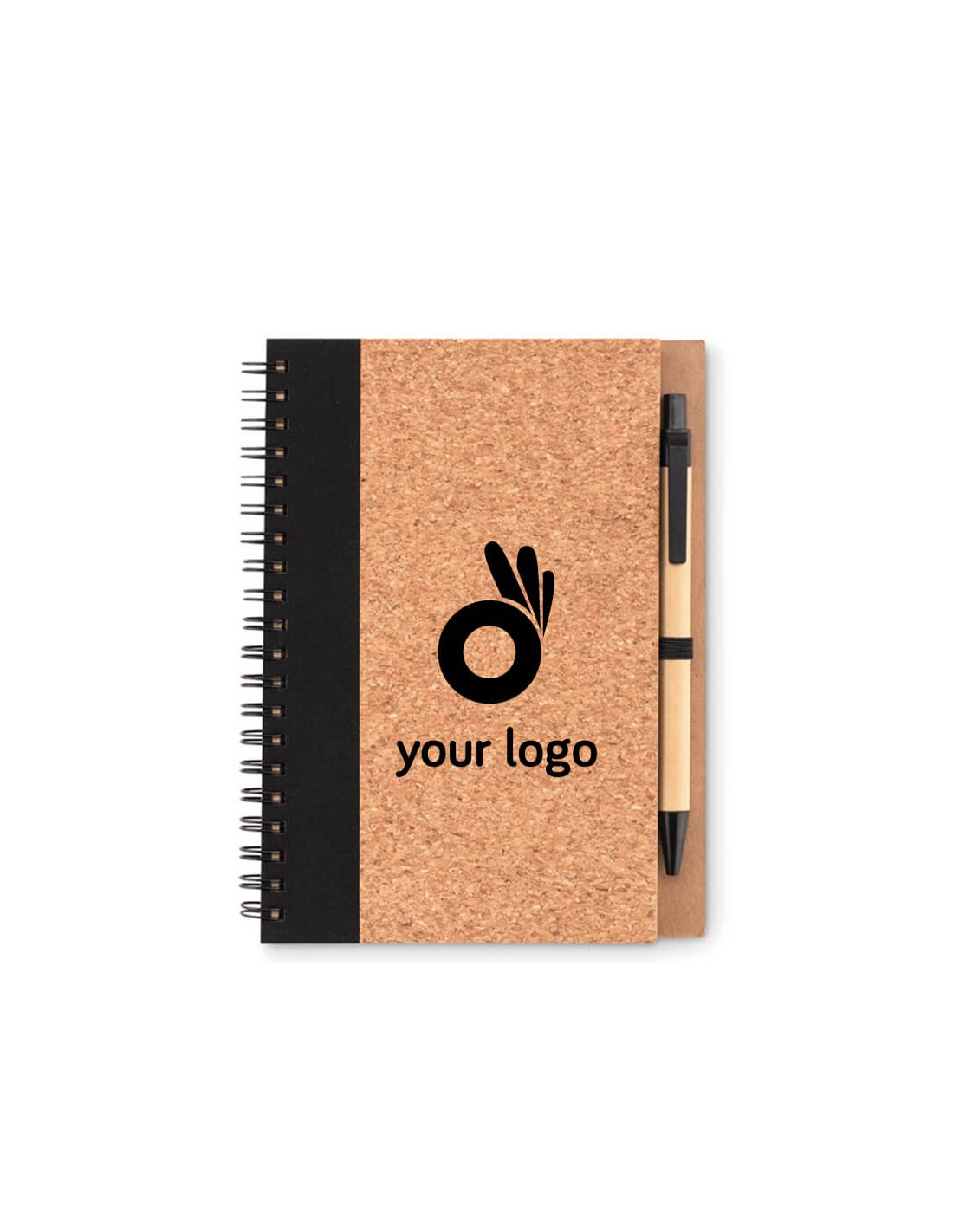 Notebook in sughero con penna. Copertura in sughero morbido. Doppio filo. 140 pagine di carta riciclata a righe (70 fogli). Penna a sfera a pulsante abbinata con fusto in cartone riciclato e dettagli in PLA di mais. Inchiostro nero. Portapenne elastico. Il sughero í¨ un materiale naturale al 100%. A causa della sua natura strutturale e della porosití della superficie, il risultato di stampa finale per articolo potrebbe presentare deviazioni.
