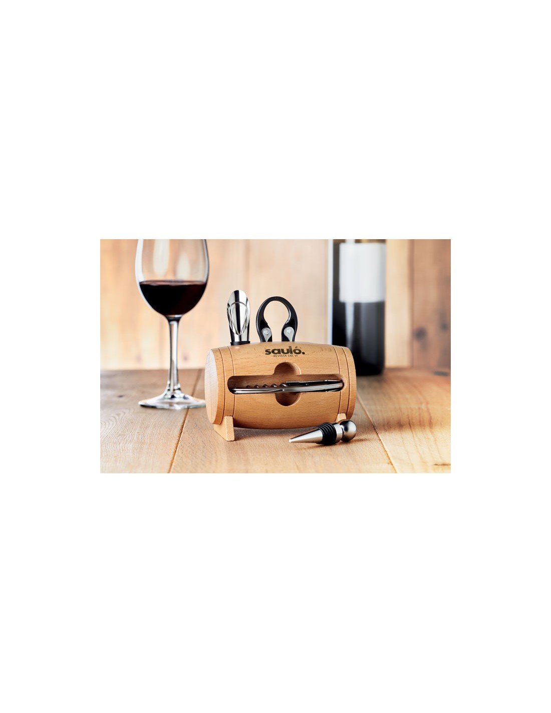 Set vino a forma di boote composto da: coltello, tappo, tappo salvagoccia e taglia-lamina. In legno.