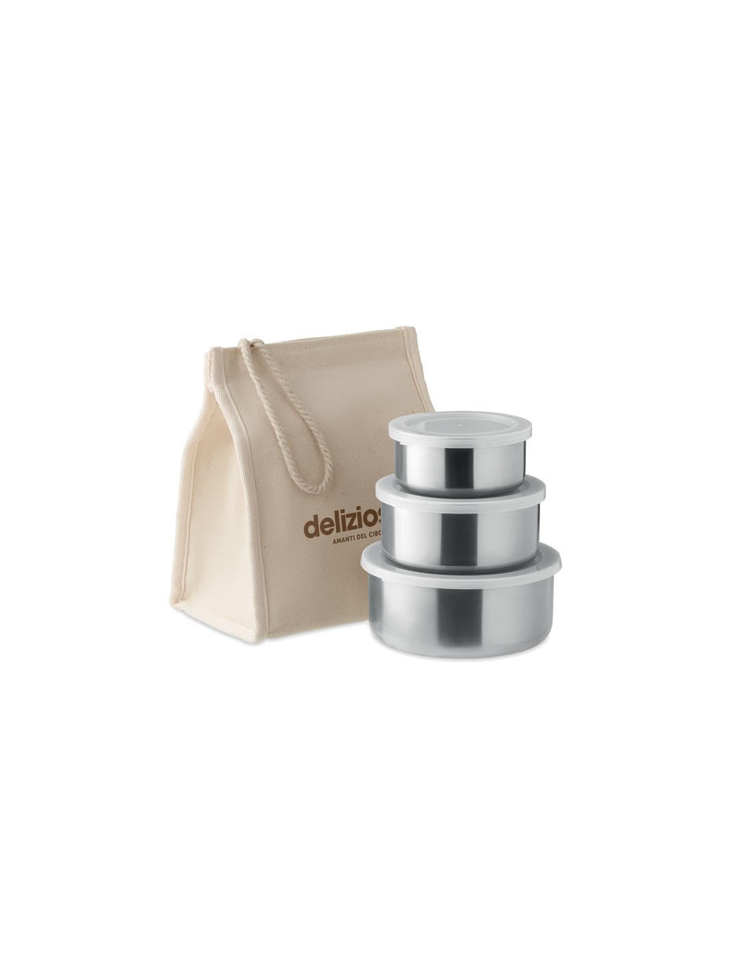 Set di 3 porta pranzo in acciaio inossidabile o set per conservare cibi, in sacchetto di cotone isolato con chiusura a gancio e anello. Materiale isolante: foglio di alluminio argentato interno e spago. Capacití : 300 ml, 500 ml e 750 ml.