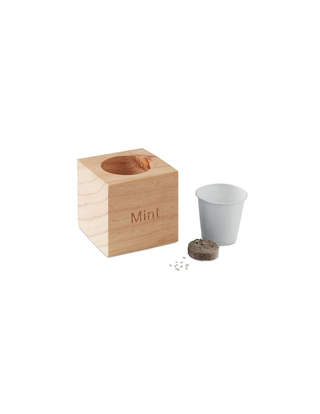 Vaso in legno con semi di menta.